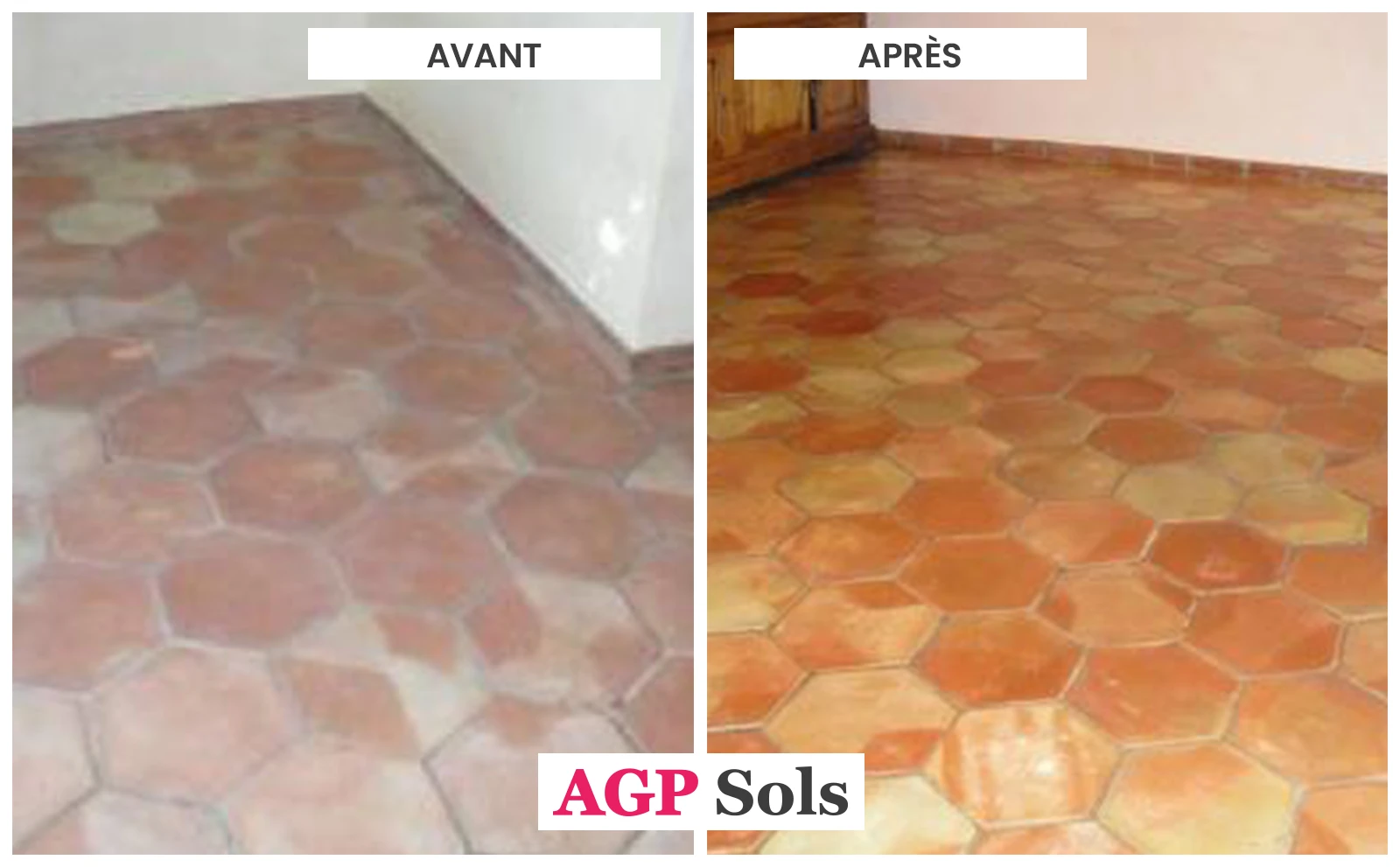 Le décapage de ce sol en terre cuite a été réalisé avec une monobrosse, du décapant et un rinçage à l’acide passivé (pour ouvrir les pores de la matière).