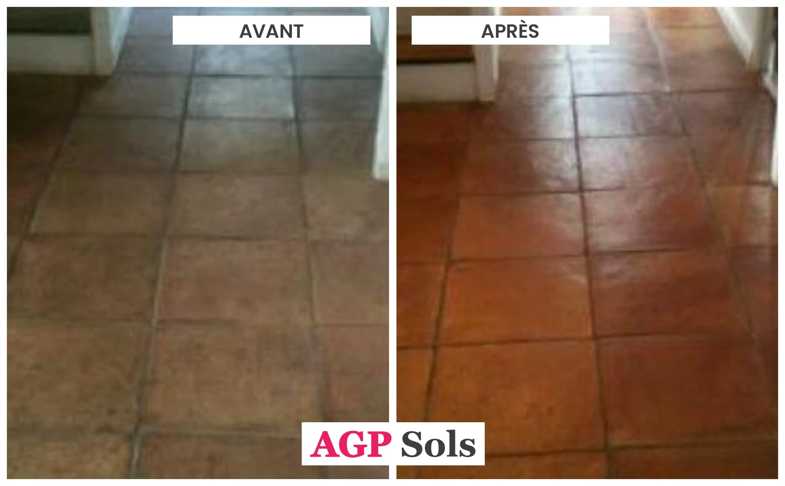 Décapagenettoyagetraitement (finition satinée) d’un sol en terre cuite à Mouans-Sartoux (06).
